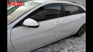 Дефлекторы окон на Hyundai Elantra 7 2021- приклеиваются на рамки дверей с помощью двухстороннего скотча 3M, который уже нанесен с задней стороны каждого ветровика.