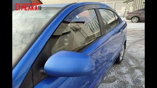 Дефлекторы окон на KIA Rio 2 2005-2011 приклеиваются на рамки дверей с помощью двухстороннего скотча 3M, который уже нанесен с задней стороны каждого ветровика.